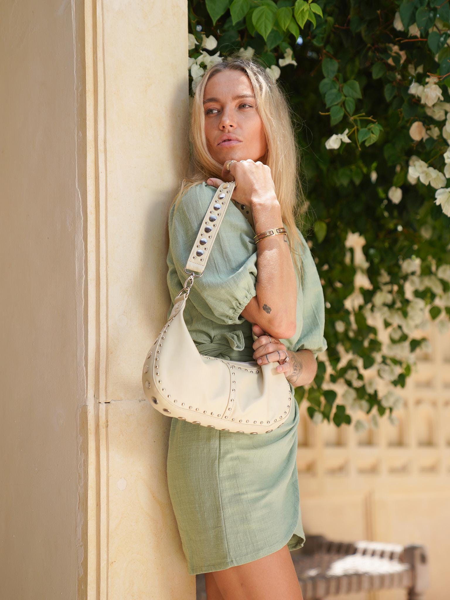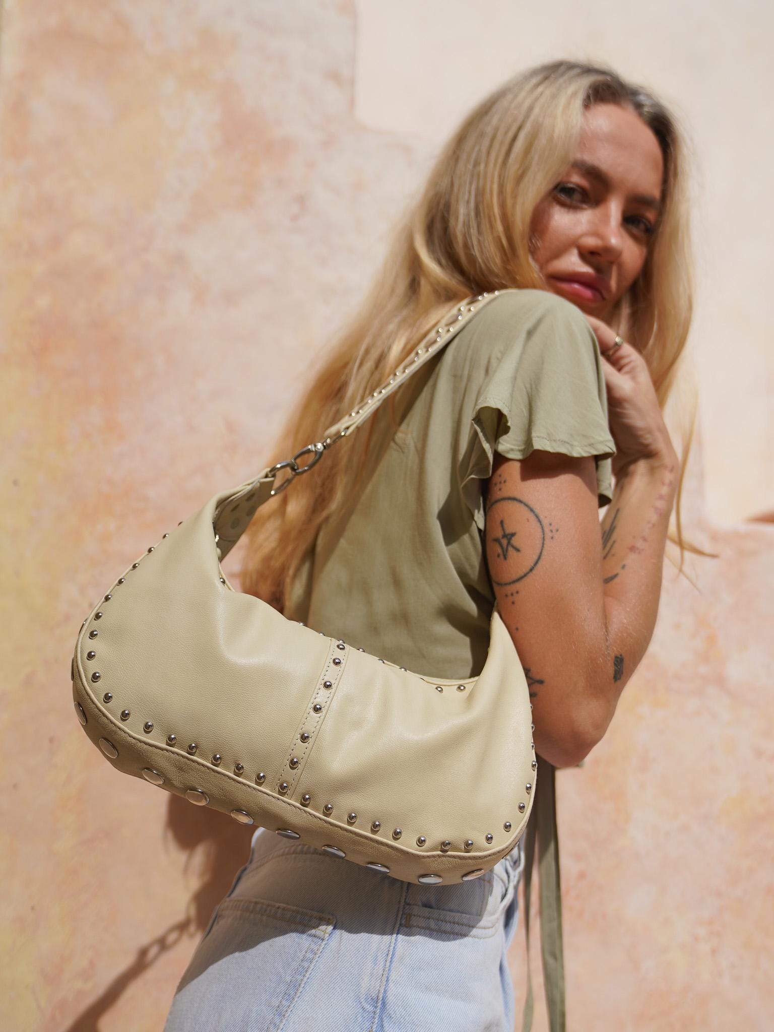 Our beige studded leather bag brings a fresh twist to classic design. The soft, high-quality leather is beautifully complemented by sleek stud details, creating a modern, fashion-forward piece. The fixed strap ensures an easy, hassle-free carry, while the roomy interior offers ample storage for your essentials.