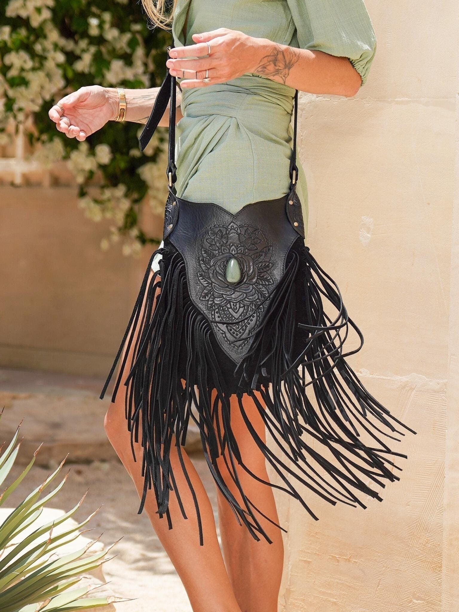 Our black hand tooled fringe crossbody bags are fashionably functionally made from high quality genuine leather. Long leather fringe embellishes the front and the side of the crossbody. This bohemian carved leather purse is our bestseller. The main compartment can be closed by a magnet. on request we can change this for a zipper if needed. This trendy hippie bag comes in brown, suede and white leather. The strap is adjustable to customize it to your outfit and style.