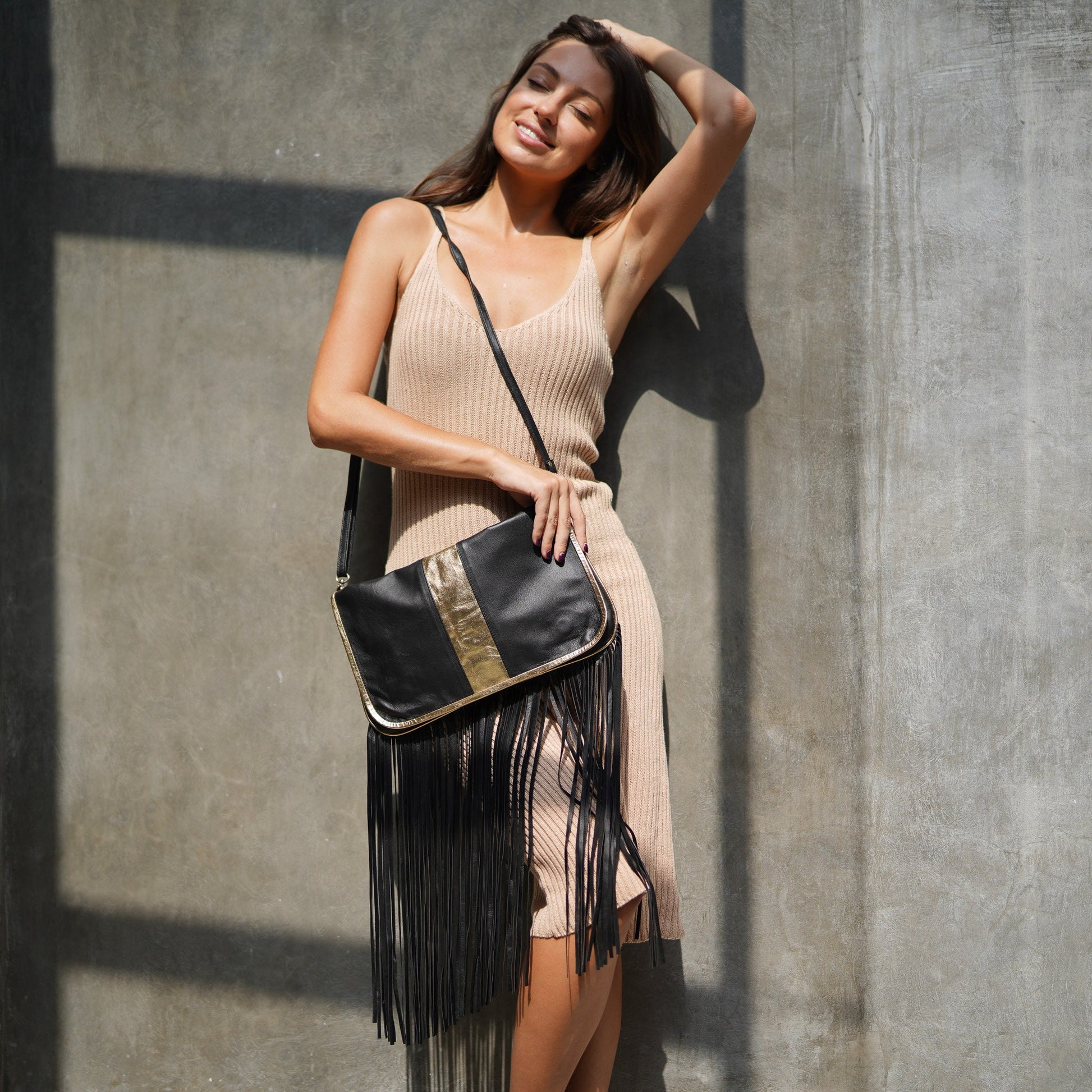 Who doesn’t love fringes! This Fringe Purse is our favorite'. Designed to hold all your essentials, our soft leather Santorini clutch is the perfect complement to an evening out. Featuring beautiful long fringes, this clutch is perfect to be used as an everyday clutch or an accessory for the night out. Comes with an adjustable thin strap.