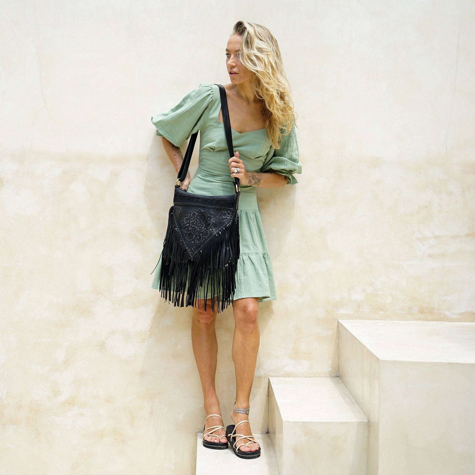 Black Tooled Bohemian Fringe Purse, Leather Crossbody bag, Boho Bag