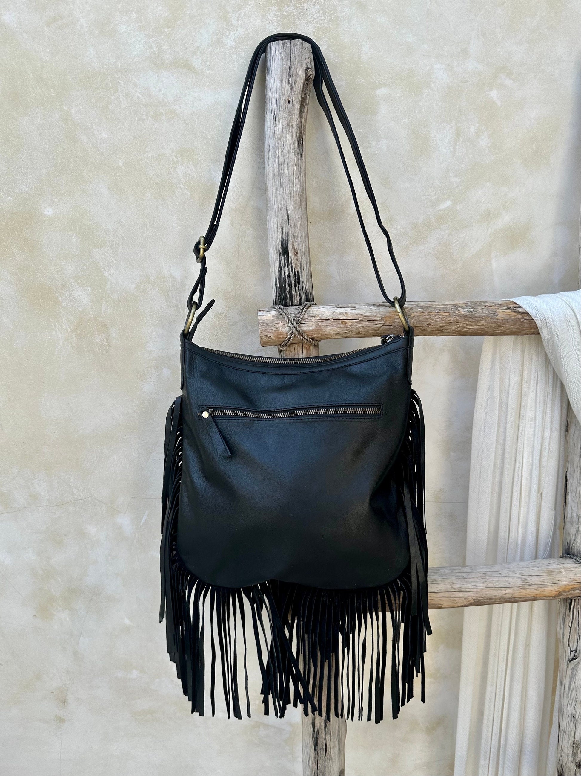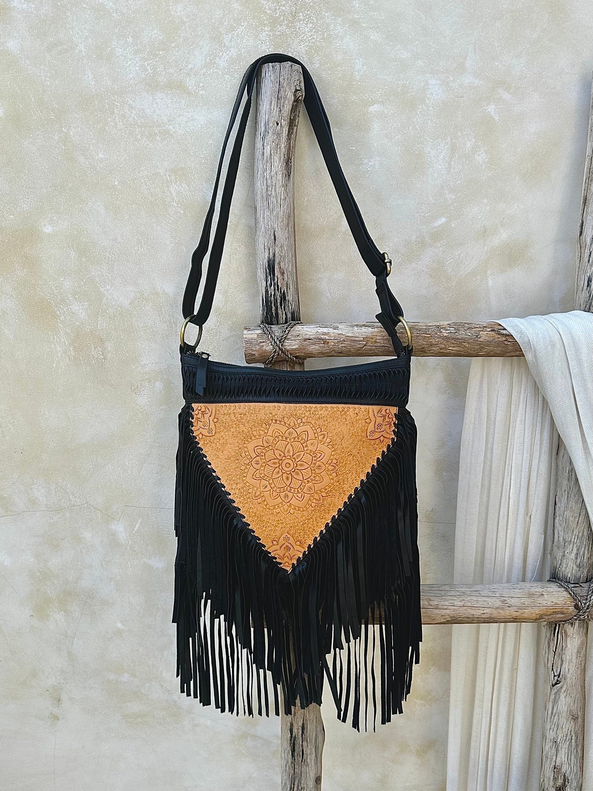 Black Tooled Bohemian Fringe Purse, Leather Crossbody bag, Western Bag