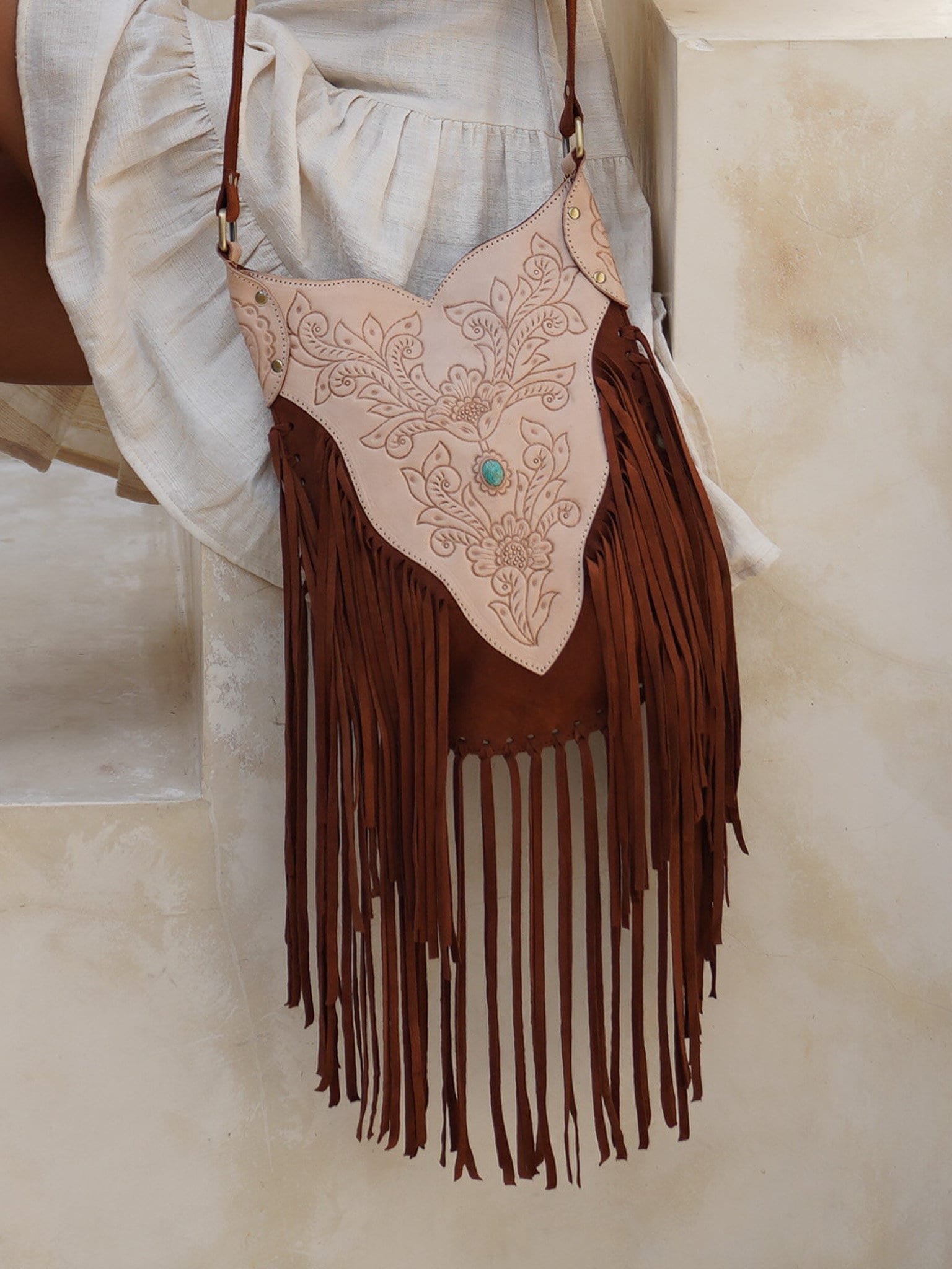 Our hand tooled fringe crossbody bags are fashionably functionally made from high quality suede genuine leather. Long leather fringe embellishes the front and the side of the crossbody. This bohemian carved leather purse is our bestseller. The main compartment can be closed by a magnet. on request we can change this for a zipper if needed. This trendy hippie bag comes in brown, suede and white leather. The strap is adjustable to customize it to your outfit and style.