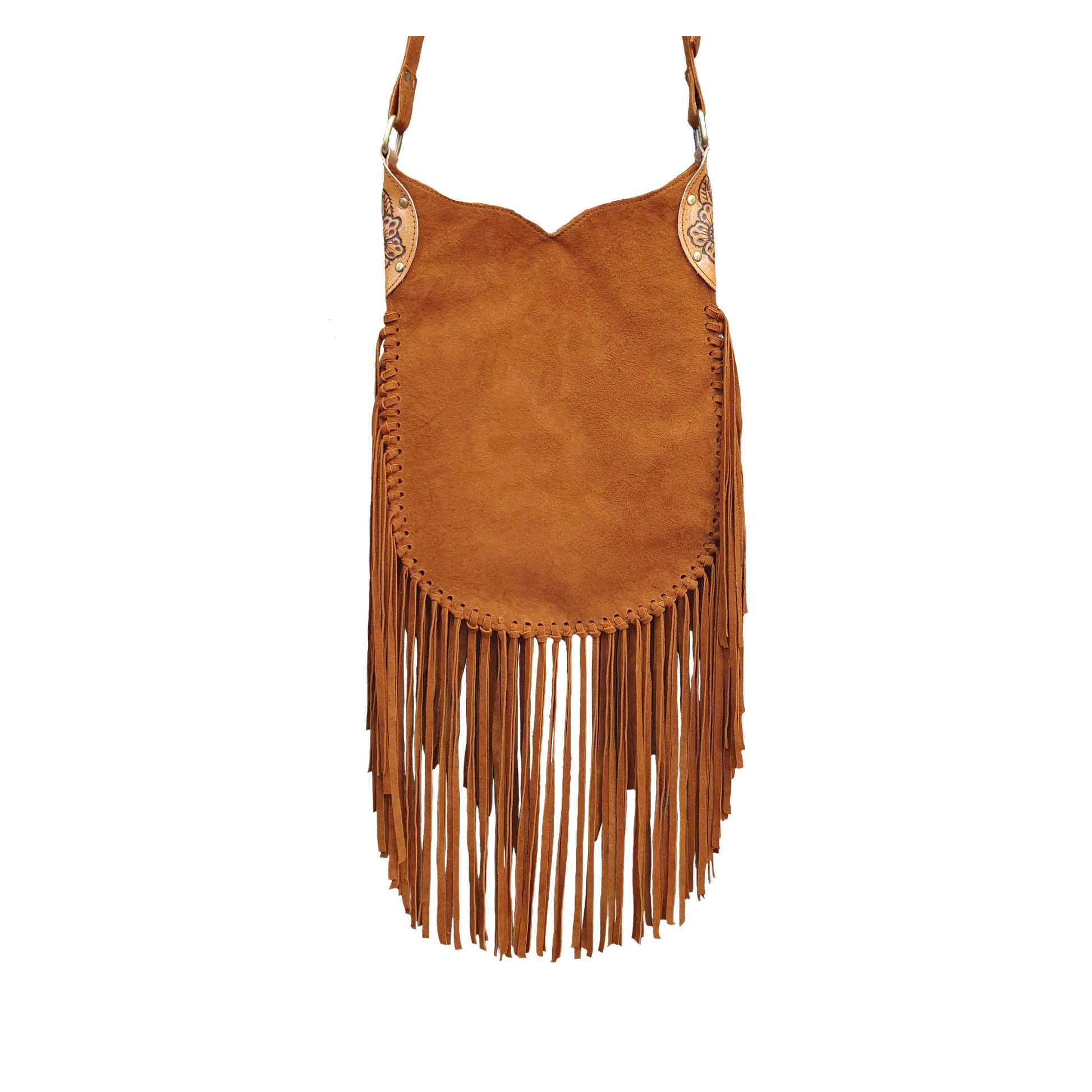 Our hand tooled fringe crossbody bags are fashionably functionally made from high quality genuine leather. Long leather fringe embellishes the front and the side of the crossbody. This bohemian carved leather purse is our bestseller. The main compartment can be closed by a magnet. on request we can change this for a zipper if needed. This trendy hippie bag comes in brown, suede and white leather. The strap is adjustable to customize it to your outfit and style.