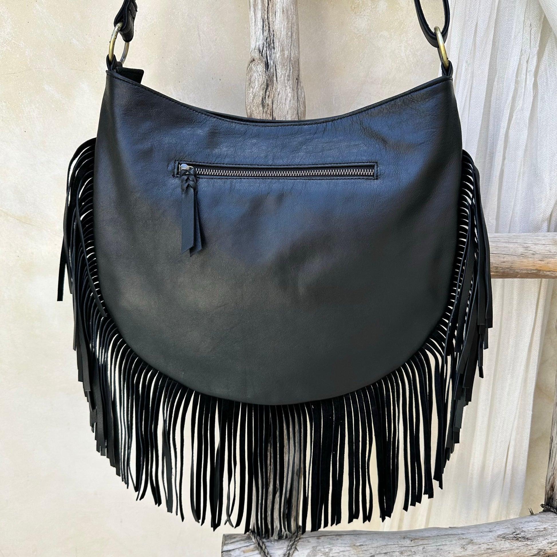 Boho Black Leather Fringe Crossbody Purse