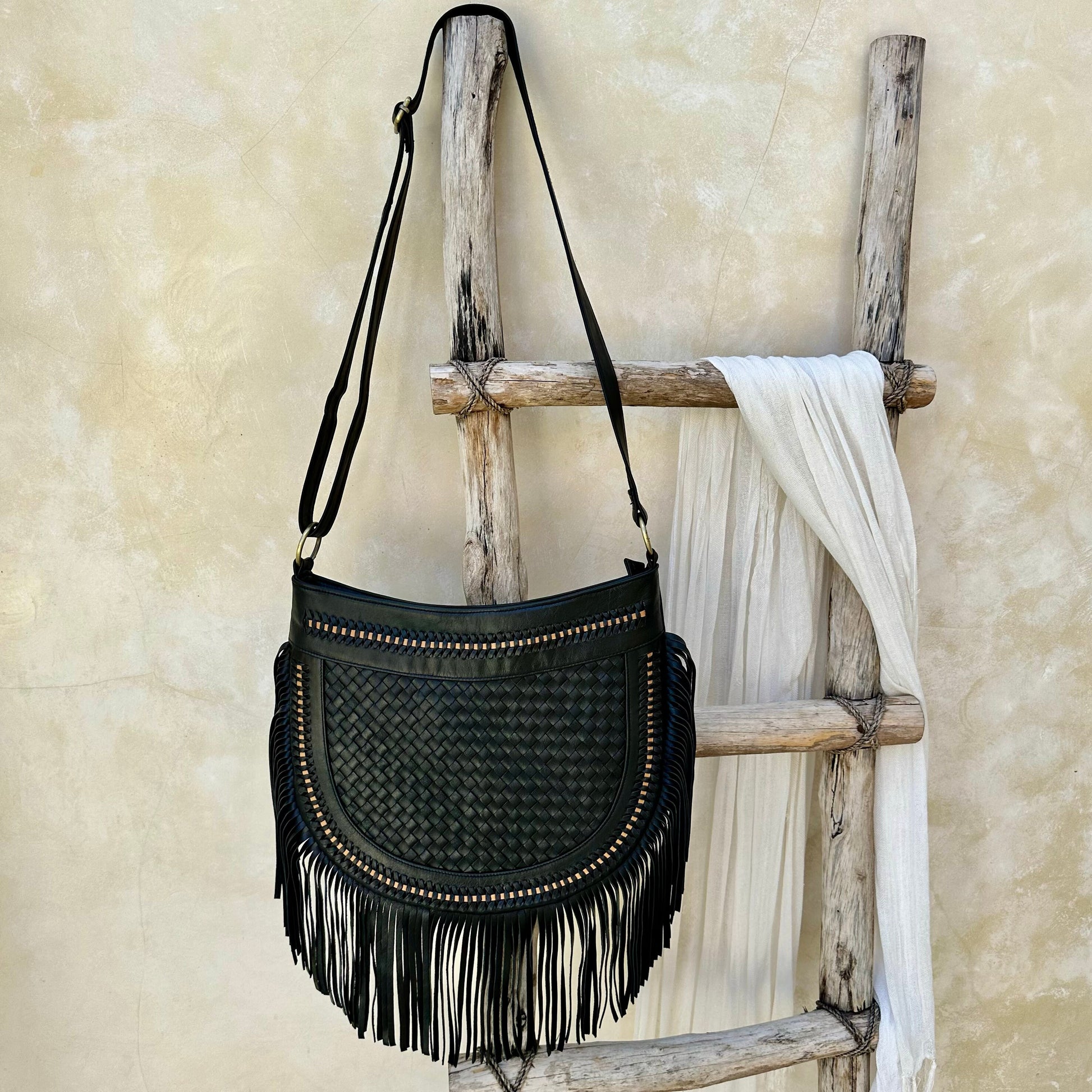 This stunning black woven leather crossbody purse is fashionably and functionally made from high quality genuine leather. Leather fringe drapes around the edges of the bag. This bohemian leather bag has a hand woven front. It has an adjustable strap that works perfectly for any outfit and adjusts to your comfort. A perfect festival Bag, hippie bag that can be used as shoulder bag or crossbody.