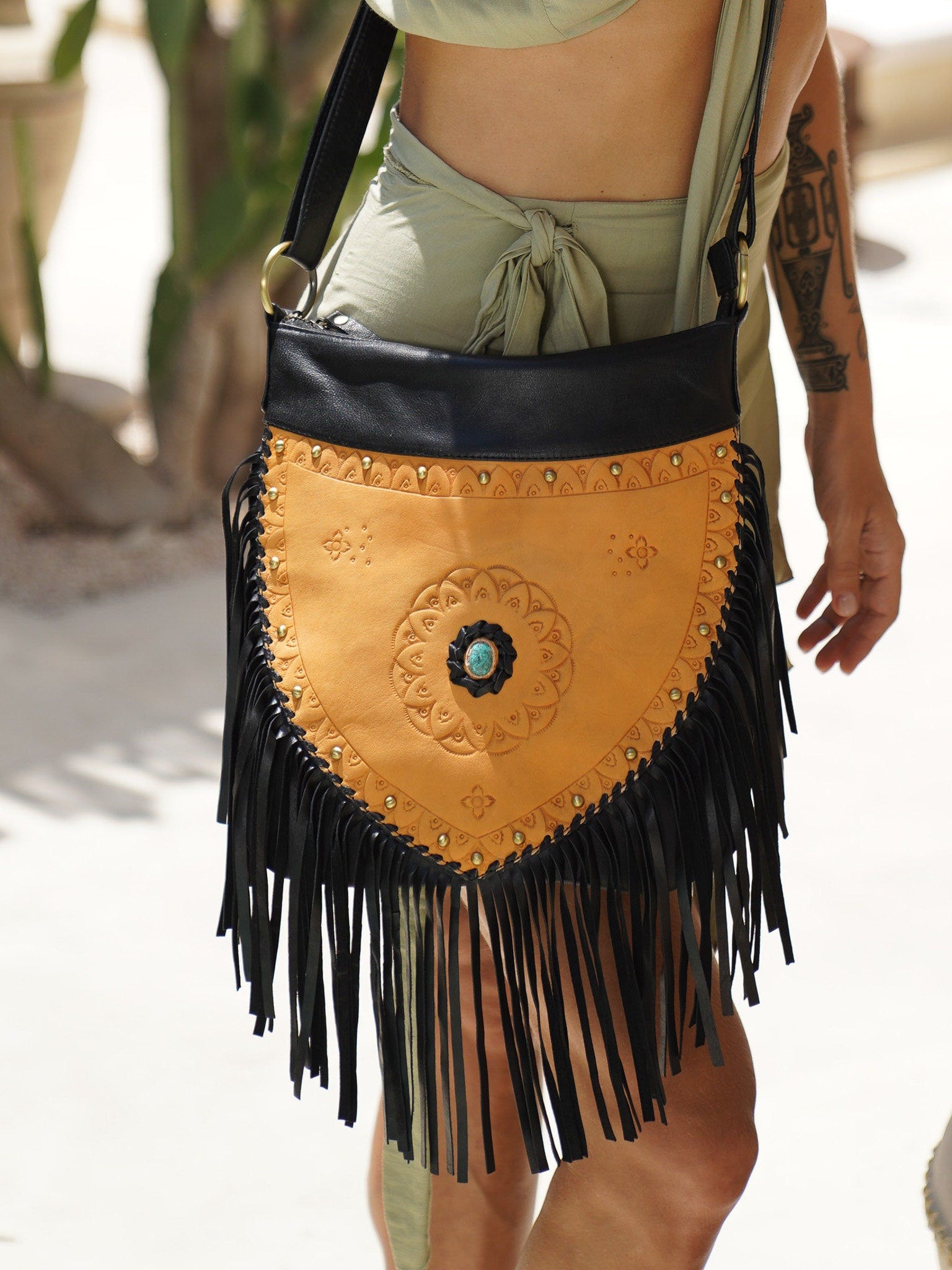 Bohemian Boho Black Leather Carved Fringe Crossbody Bags~Festival bag