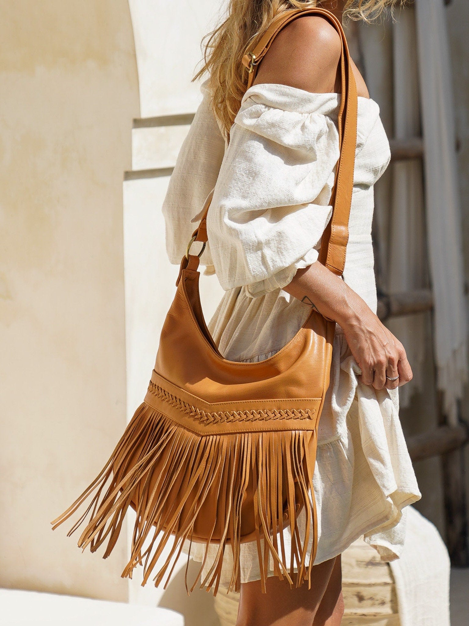 Bohemian Boho Tan Leather Fringe Hobo Bag