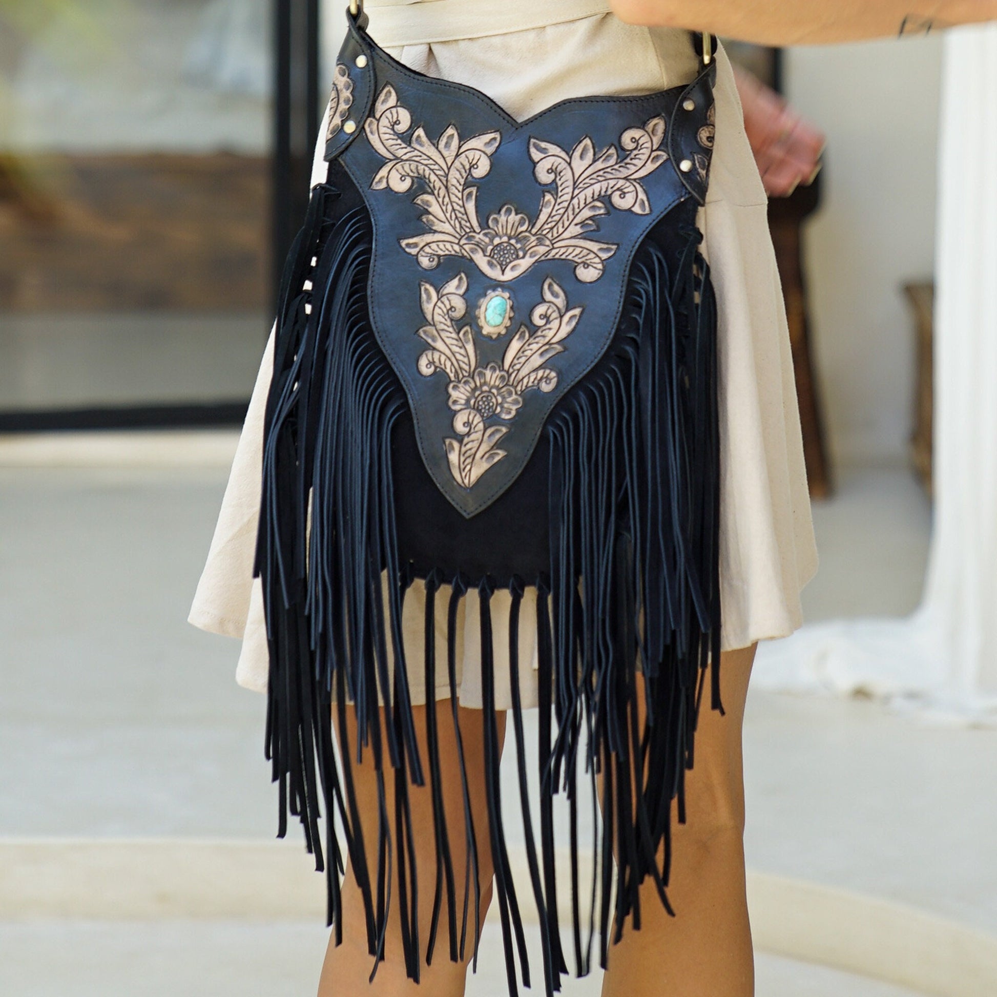Our cross body bag is fashionably functionally made from high quality genuine leather. Long leather fringe embellishes the front and the side of the crossbody. Made of high quality black suede leather. This bohemian carved leather purse is our bestseller. The main compartment can be closed by a magnet. on request we can change this for a zipper if needed. The strap is adjustable to customize it to your outfit and style.