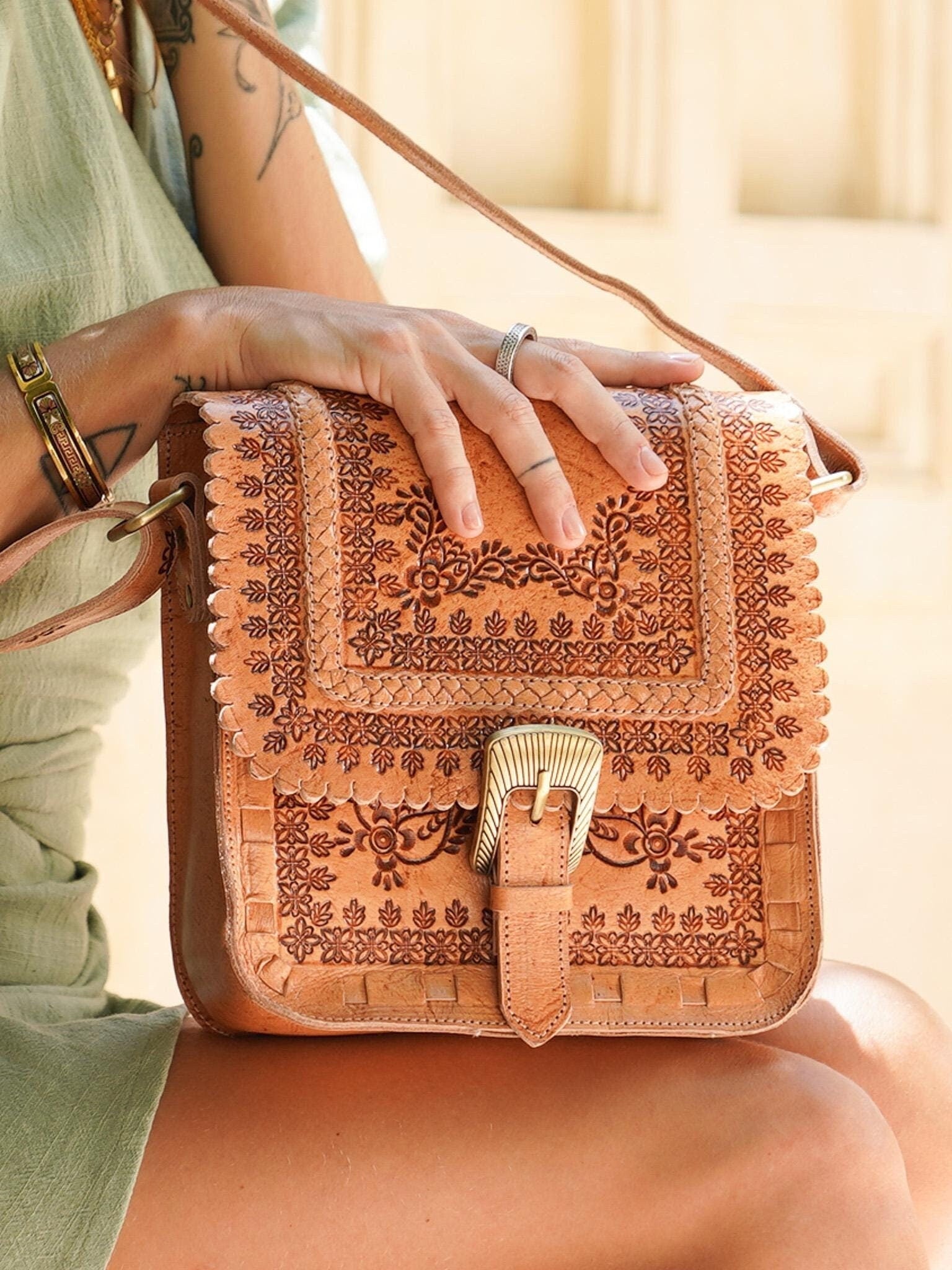 Our hand-tooled leather crossbody bag is the perfect accessory for boho lovers. Made from hard, structured leather, this bag is intricately carved with beautiful, artisanal details, giving it an authentic, vintage feel. The durable design is ideal for everyday use, while the adjustable strap allows for customized comfort. Whether you’re at a festival or exploring the city, this bag effortlessly complements your carefree, bohemian style.