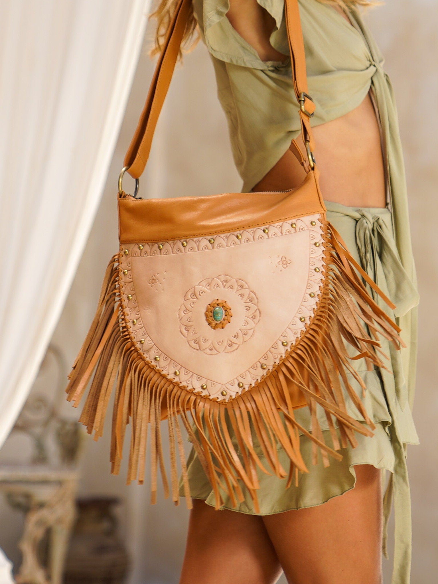 Tan Leather Fringe Purse, Boho Leather Crossbody Bag, Festival Bag
