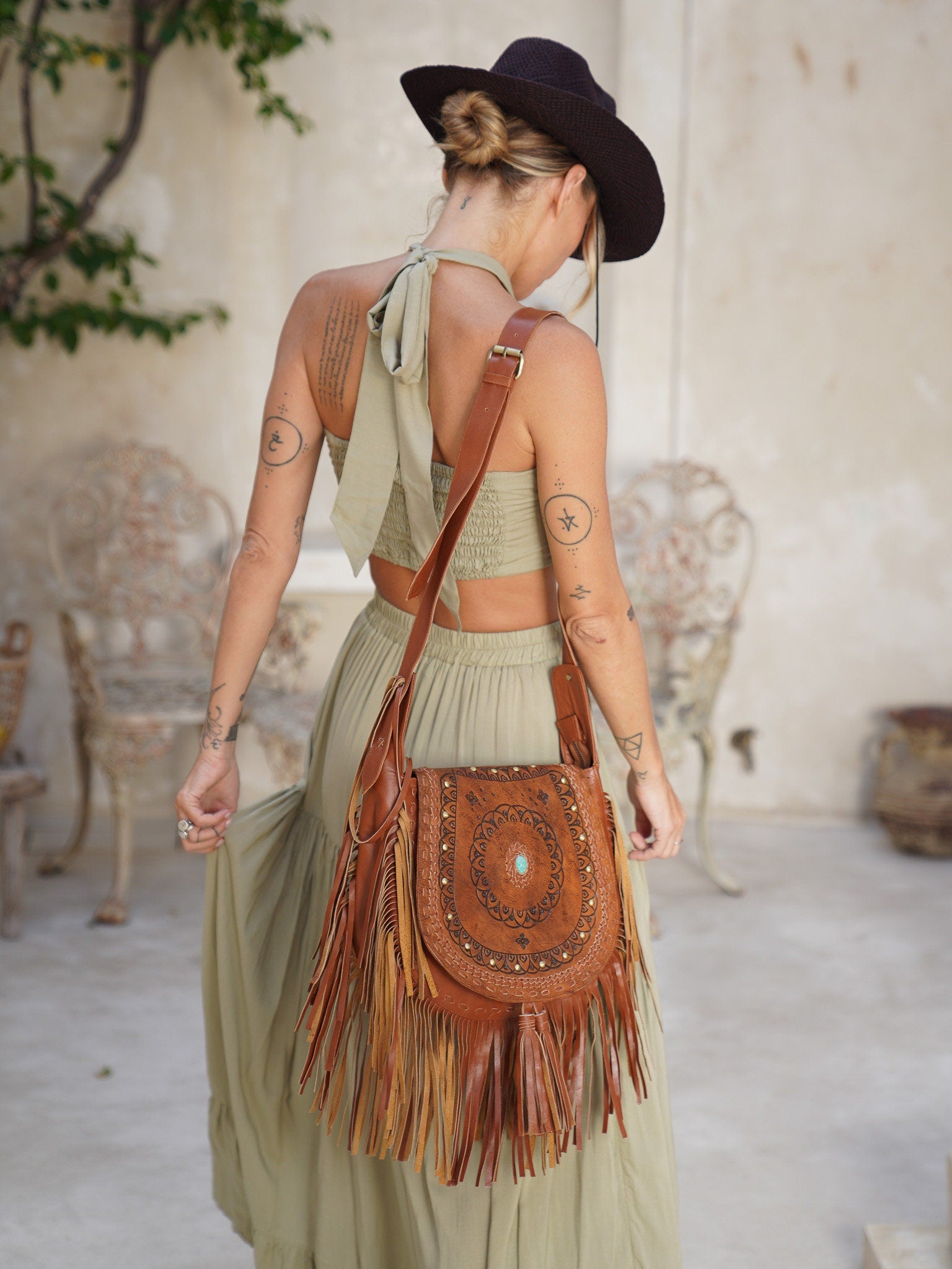 Our brown tooled leather boho crossbody bag for Women has a unique design. Created for a Boho, Festival and hippie lovers!